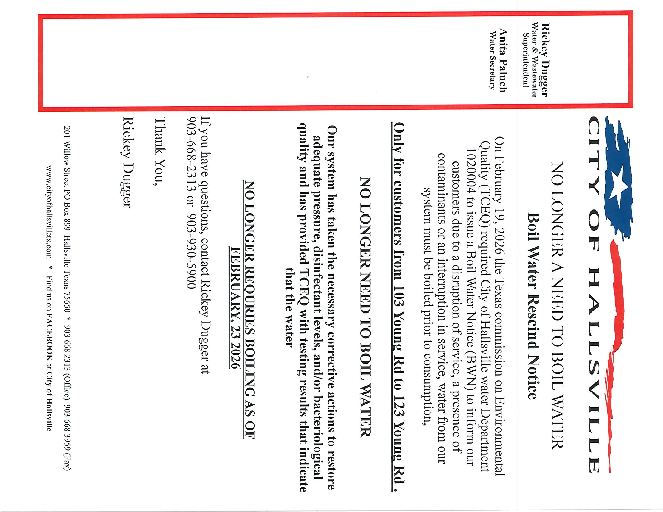 You will still receive a postcard bill, but if you would rather receive your bill thru email, please let us know. If we have your email listed on your account, you can go to our website cityofhallsvilletx.com and log into “Pay Your Utilities Here”, create an account and view your bill and your bill history.